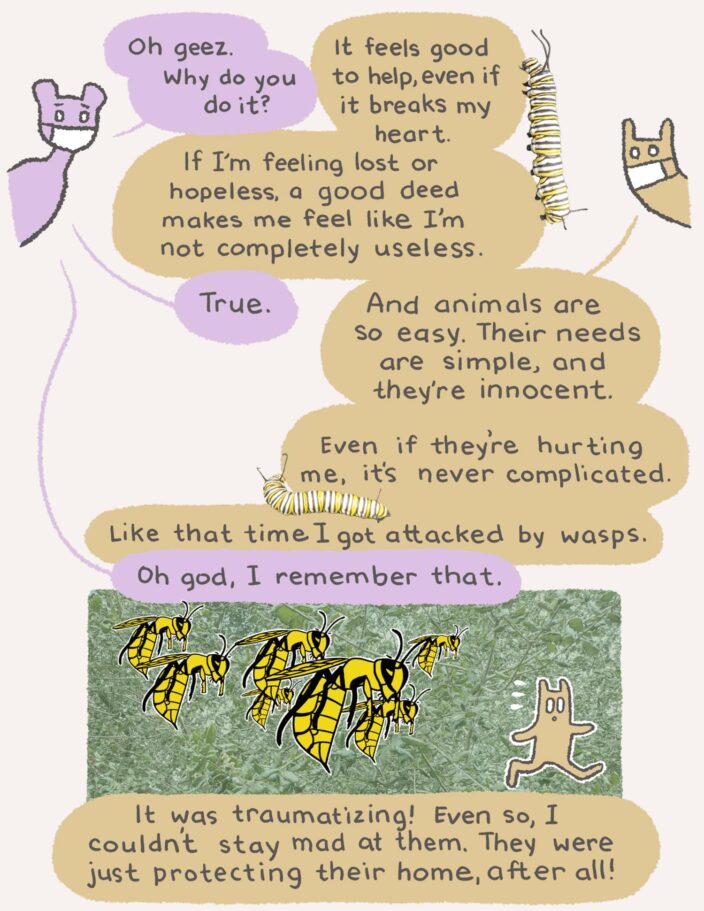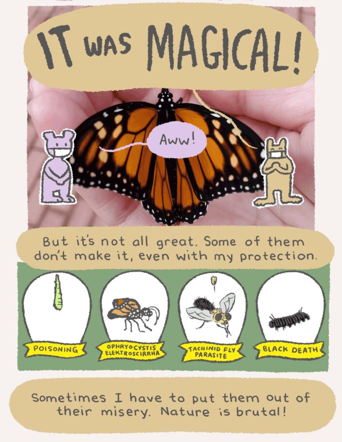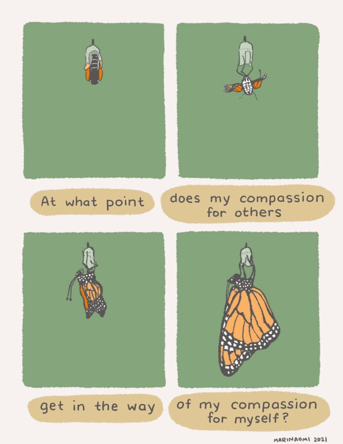 Hi friends, We’ve got a special comic edition from award-winning author and illustrator MariNaomi for you. What starts as a story about milkweed seedlings and baby butterflies expands into a meditation on compassion: How do we help people when we feel threatened or put off by them? Can we protect our little corner of the world but still make space for others? Not promising any straightforward answers, but then this wouldn’t be art about self growth now, would it? 😘 Hang in there, THE PRISM TEAM RuPaul knows what’s up. Having compassion for others is [checks notes], yeah, pretty hard when we don’t have compassion for ourselves. As the other saying goes: You can’t pour from an empty cup. To take it back to basics for a sec, compassion is when we have an awareness of another’s suffering and an urge to alleviate it; it’s a desire to make things better. Turning the lens of compassion on ourselves means first: noticing when we’re beating ourselves up and spiraling into harshly critical self-talk; and second: treating ourselves with kindness and understanding instead. It If you’re curious where you land on the self-compassion scale, this test is useful for understanding which thought patterns and behaviors are and are not your friend. (Pro tip: You can get your results without entering any data.) Hope your Sunday is more emerging from chrysalis than stuck in the goo. P.S. If you’re curious what the collective noun for butterflies is, it’s kaleidoscope. How ‘bout that.Love thy neighbor?